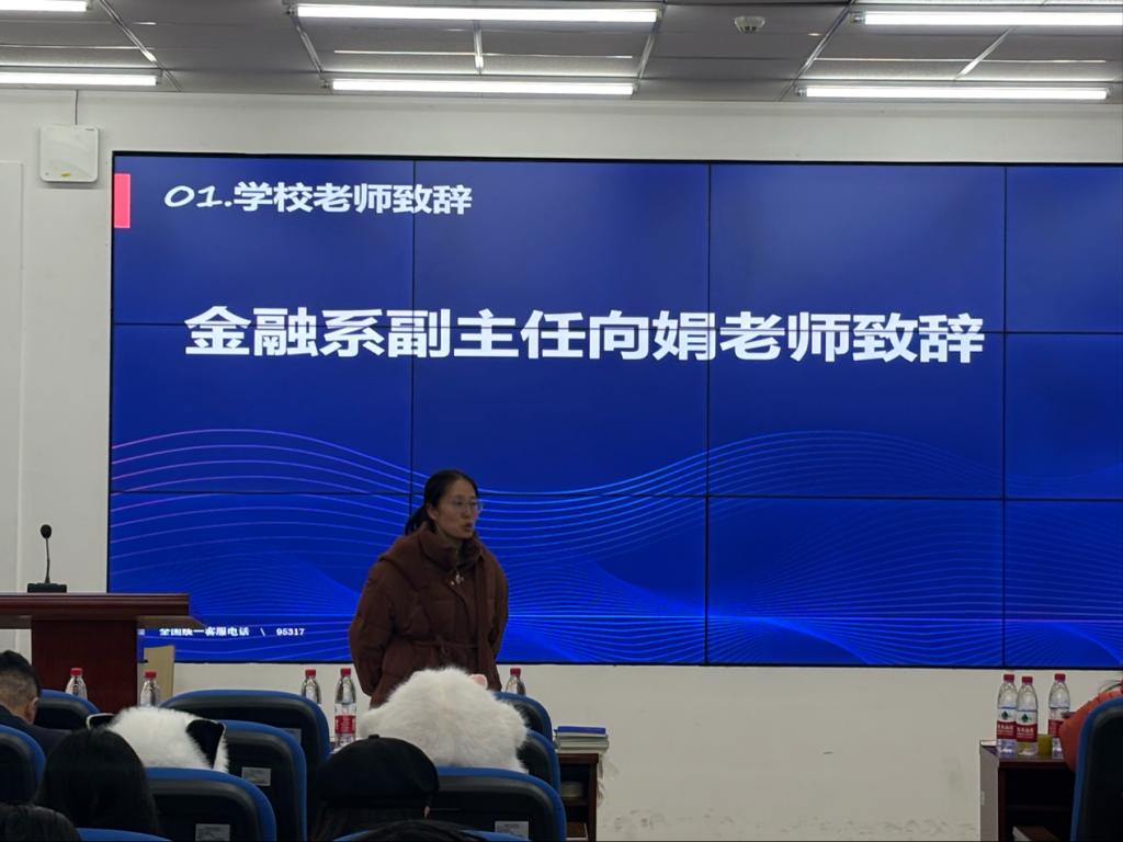 颁奖典礼分为四个主要环节:首先,由金融系副主任向娟老师致辞。她对财信证券股份有限公司的大力支持表示衷心感谢,并对获奖学员们表示热烈祝贺。她强调,金融是现代经济的核心,国家对金融人才的需求日益增长。此次大赛为学生们提供了一个展示自我、锻炼能力的平台,希望大家能够珍惜这次宝贵的经历,将所学知识转化为实际应用能力,为未来的职业发展打下坚实基础。