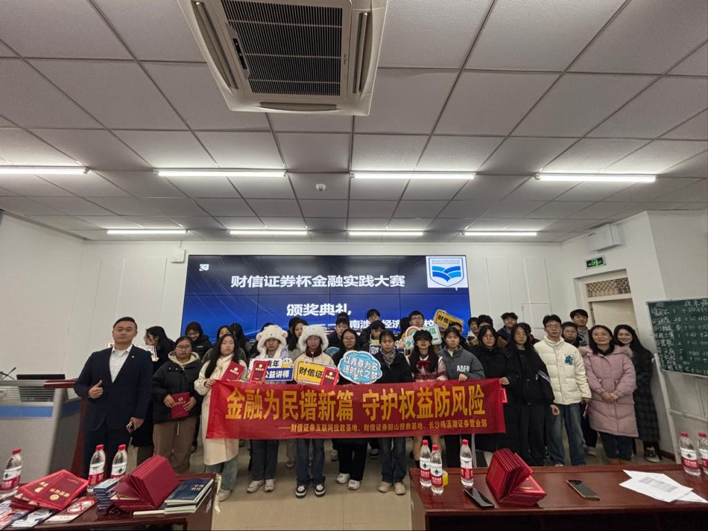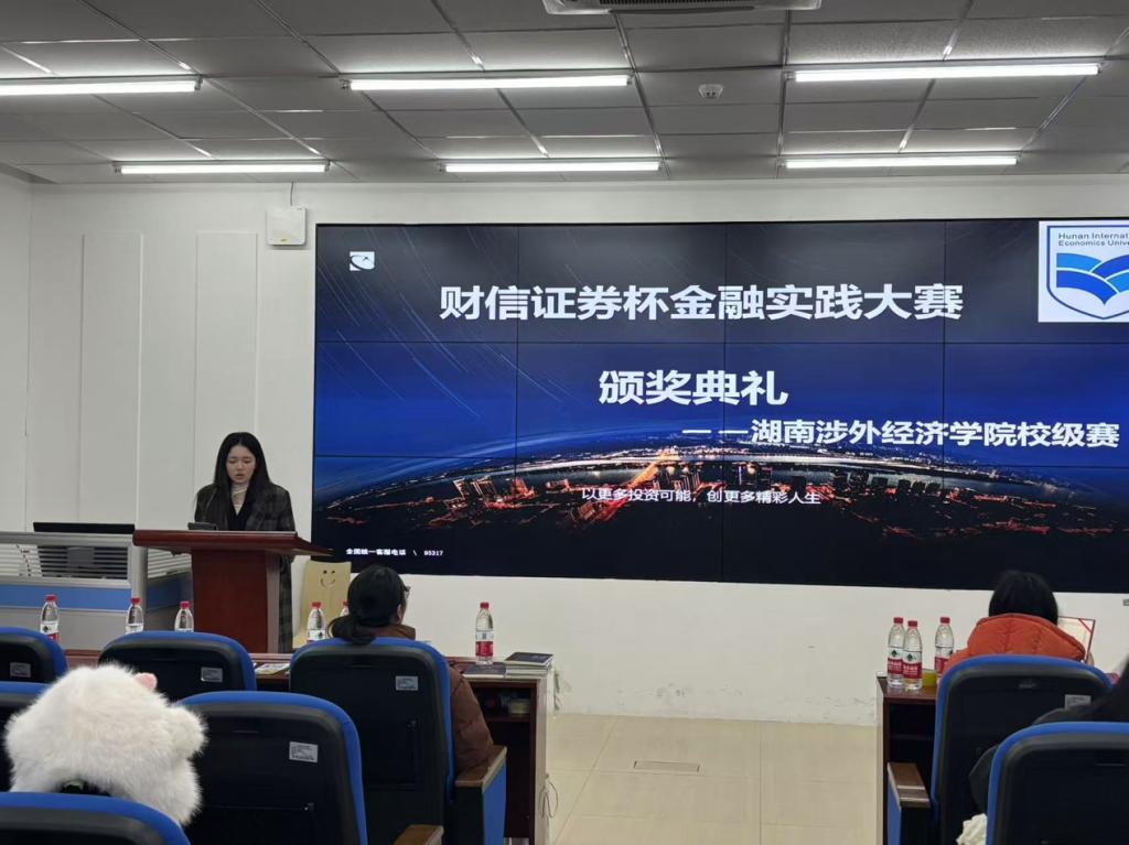 2024年12月24日财信证券高校金融实践大赛湖南涉外经济学院校级赛颁奖典礼在我校综合楼商科大学生创新创业中心项目路演厅(C315)顺利举行。此次颁奖典礼由湖南省证券业协会、湖南涉外经济学院联合财信证券股份有限公司共同主办,湖南涉外经济学院证券投资协会协办,得到了学生的广泛支持。