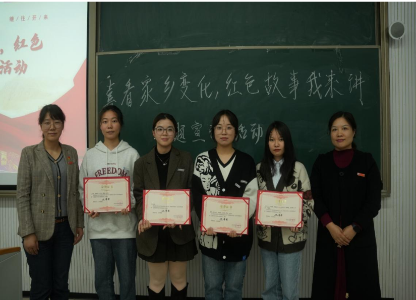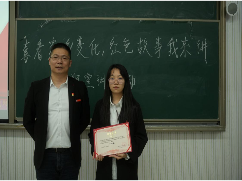 经过激烈角逐,商学院“喜看家乡变化,红色故事我来讲”实践展示活动小组展现最终评定结果如下:行管2101班田云小组获得一等奖,李向明书记为获奖选手颁奖。