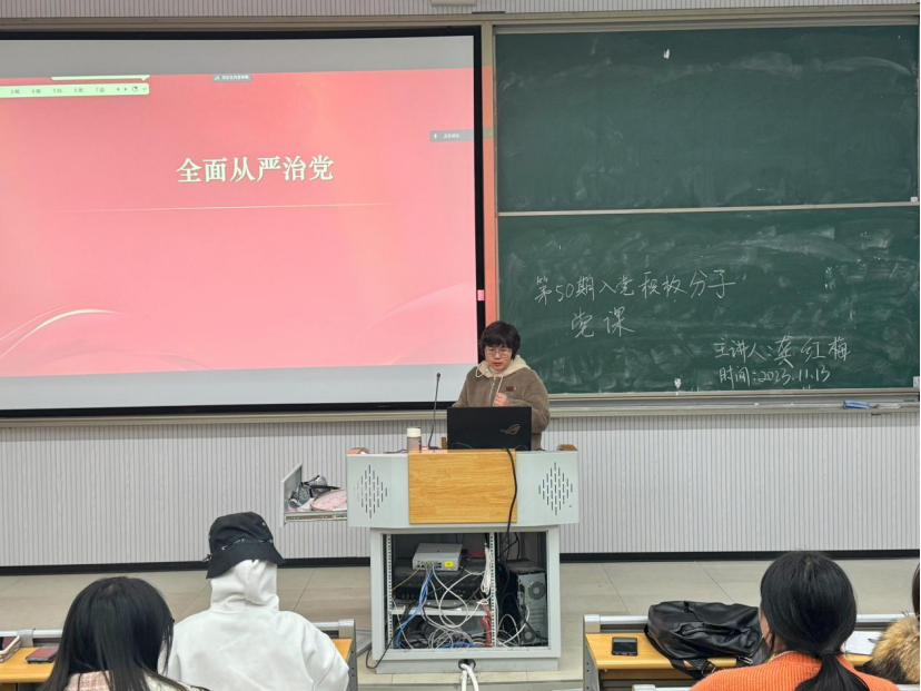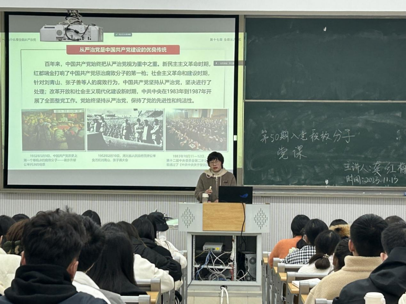 为深入开展学习贯彻习近平新时代中国特色社会主义思想主题教育走深走实,深刻阐述健全全面从严治党体系的目标任务和实践要求,扎实推进我校党建工作高质量发展。2023年11月13日晚7点,龚红梅老师在二教二阶开展了以“全面从严治党”为主题的党课培训。