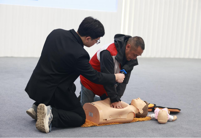 在培训中孙老师还借助假人模型为大家进行实操演示,就心肺复苏和AED仪器使用的最佳时间、技术要点、实施步骤、注意事项为大家进行详细的讲解。