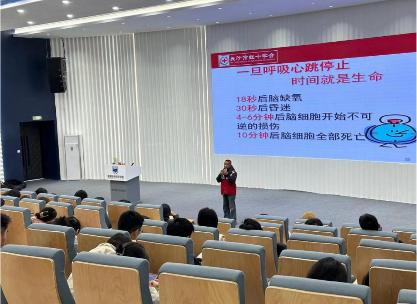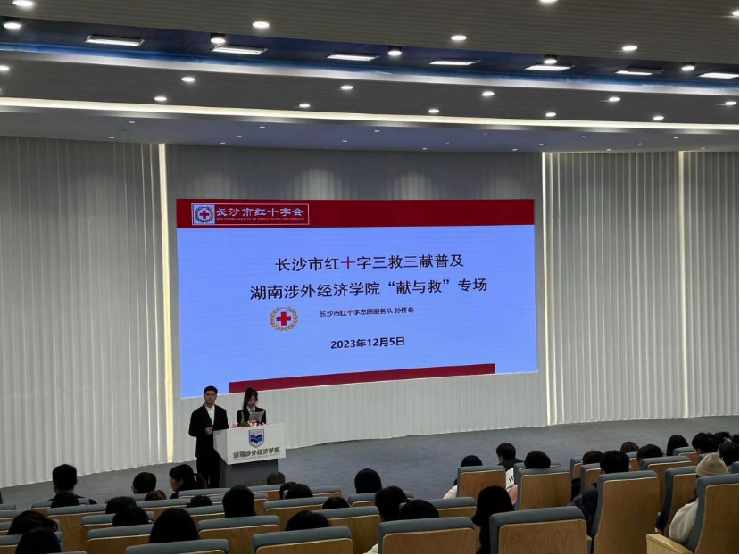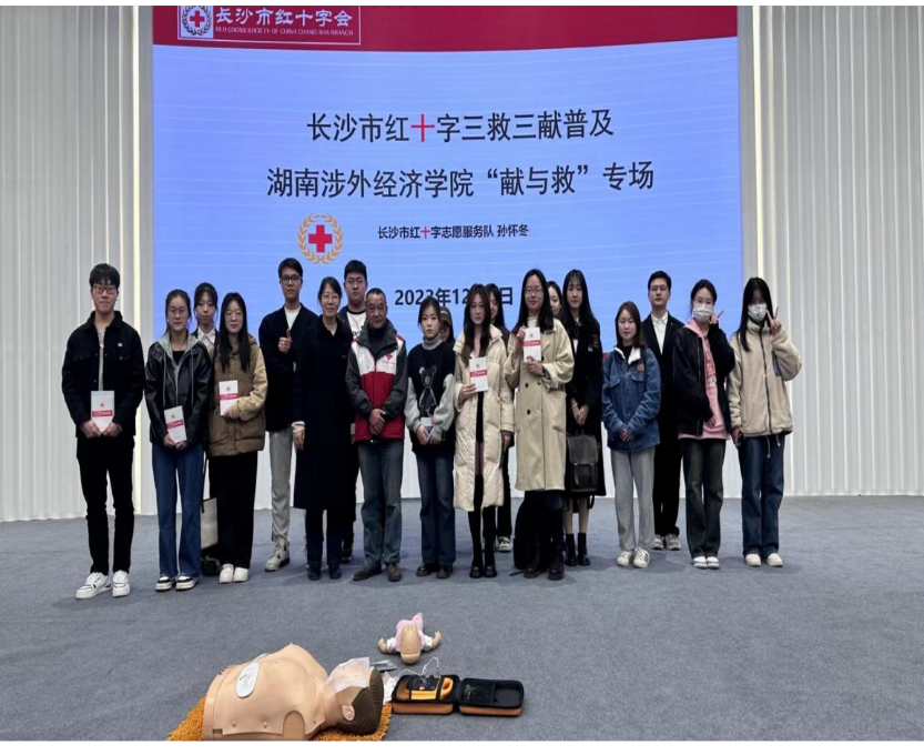 为进一步普及校园师生急救知识,切实提高师生自救互救能力,2023年12月5日,湖南涉外经济学院商学院“商小蚁”志愿服务队特邀请长沙市红十字会五星级红十字志愿者,红十字心唤醒项目急救户外推广负责人孙怀冬老师在学术讲堂为200多位师生进行了救护知识专场培训。