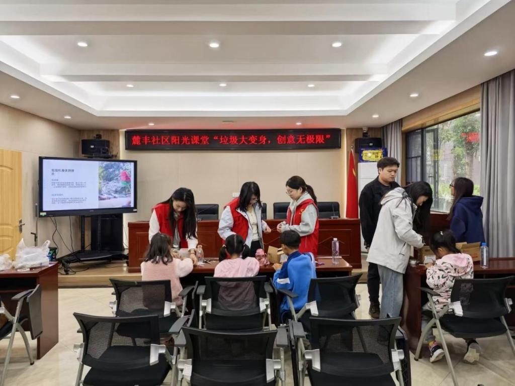 “旧纸箱能做什么?”“塑料瓶怎么变成艺术品?”11月8日上午,麓丰社区的活动室里,孩子们的奇思妙想接连迸发。当天,“商小蚁”志愿服务队走进社区,开展以“垃圾大变身 创意无极限”为主题阳光课堂活动,一场融合志愿热情与环保创意的绿色之约就此启幕。
