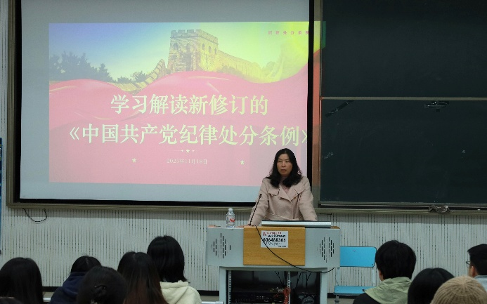 为强化党员发展对象的理论素养与纪律意识,11月18日,商学院在二教三阶举行《中国共产党纪律处分条例》(2023年修订)专题党课。本次党课由商学院党总支组织员史婷婷老师主讲,面向全院党员发展对象开展集中授课。