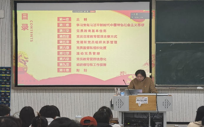 结合预备党员成长实际,徐老师详细解读了“党员教育基本任务”等相关内容,引导学员明确理论学习、党性修养、服务群众等方面的具体方向。此外,她还介绍了《条例》中关于党员监督与组织处置、流动党员管理、信息化建设及组织领导等章节的核心要求,为党员规范行为、党组织落实管理提供了清晰的制度依据。