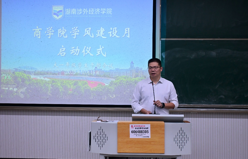 为进一步加强学风建设,营造良好的学习氛围,提升学生综合素质,2025年10月16日晚,湖南涉外经济学院商学院于二教一阶教室举行“学风建设月”活动启动仪式。本次活动旨在引导广大同学树立正确的学习态度,培养良好的学习习惯,进一步推动学院优良学风的形成与发展。商学院党总支书记李向明、团总支书记马尚奇、团总支副书记肖卓、主要学生干部以及大一年级各班班长、团支书、副班长出席活动。