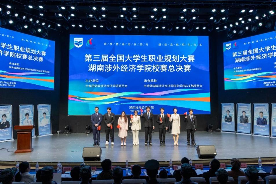 为深入贯彻落实党中央、国务院关于高校毕业生就业工作的决策部署,全面提升大学生职业生涯规划意识和就业核心竞争力,持续推动职业生涯教育与就业指导工作走深走实,湖南涉外经济学院第三届大学生职业生涯规划大赛总决赛于2025年12月24日晚在世纪讲坛隆重举行。