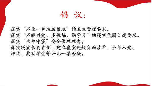最后,李向明书记向所有寝室长们发出倡议:落实“不让一片垃圾落地”的卫生管理要求;落实“不睡懒觉、多锻炼、勤学习”的寝室氛围创建要求;落实“生命守望”安全管理理念;落实寝室长负责制,建立寝室违规负面清单,当年入党、评优、奖学金等评比一票否决。