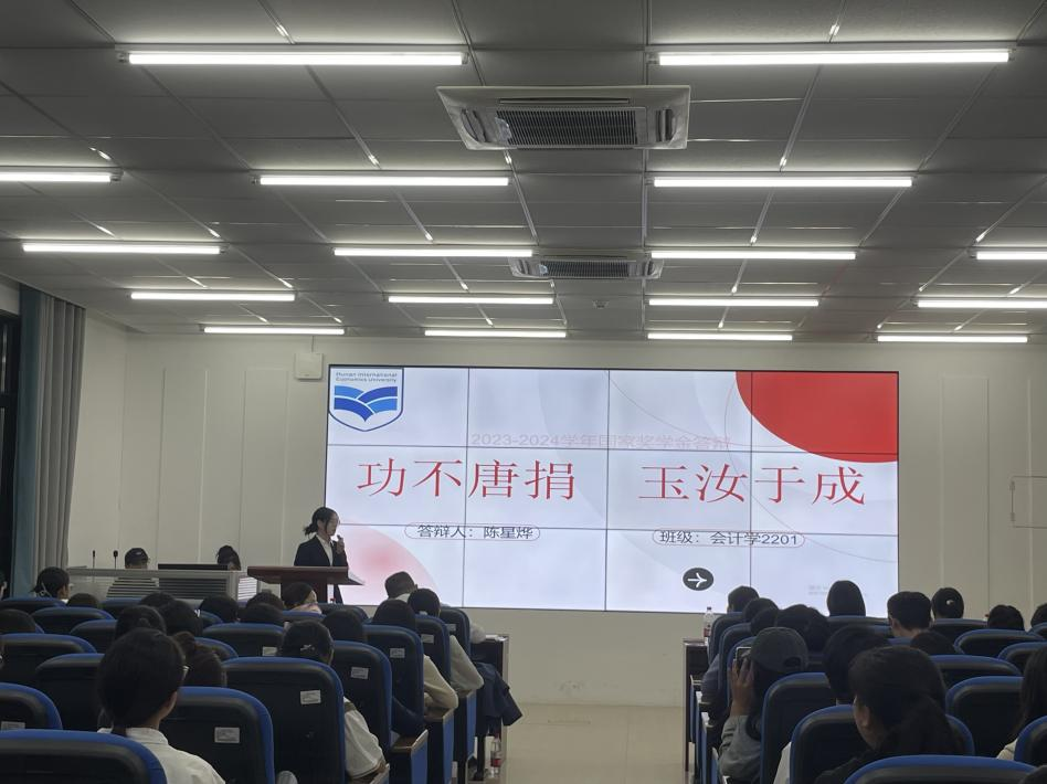 答辩会上,入围答辩选手通过PPT现场展示,围绕思想品德、学业成绩、专业竞赛、社会实践及志愿服务等方面进行个人风采展示,充分展现了商院学子在专业学习上的刻苦钻研,在学科竞赛中创新拼搏,在志愿服务中传递温暖的青春作为。他们用精彩蜕变和辉煌成就展示了学校“党建+素质教育五项工程”的育人成果,用自己的青春故事践行着“至善至美,自立自强”的铮铮校训。