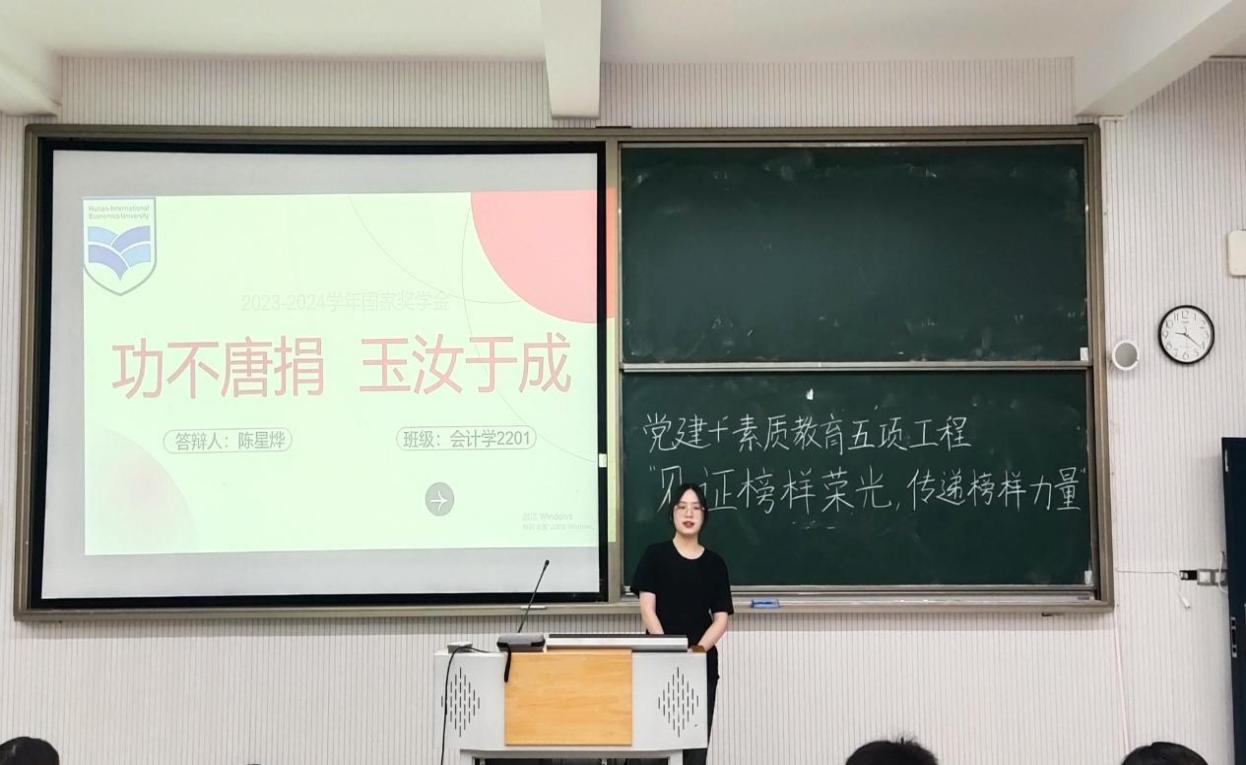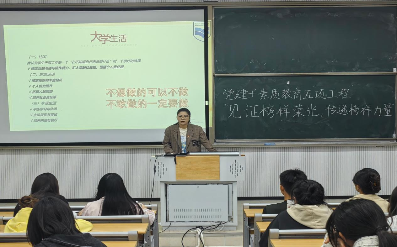 为深入学习贯彻习近平总书记关于教育的重要论述,紧紧围绕立德树人根本任务,扎实推进党建+大学生素质教育“五项工程”走深走实,充分展现国家奖学金获奖学生的精神风貌,发挥获奖学生的示范、引领、激励作用。2024年11月14日19时湖南涉外经济学院商学院于二教二阶召开“见证榜样荣光,传递榜样力量”第七场宣讲会暨第一阶段总结表彰,参会领导有商学院党总支书记李向明、团总支书记马尚奇,奖助学专干刘雅老师,通过国家奖学金获得者分享的亲身经历和心得体会,激励全院学子勤奋学习、追求卓越,共同谱写新时代的青春华章。