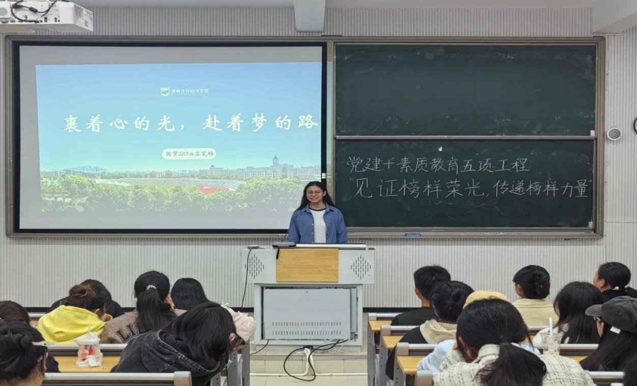 国际经济与贸易2201苏笔畅学习三种语言,分享学习习惯与经验,提醒同学们要设定目标、制定计划,自律自学、稳中求进,不怕挫折、坚定信念。同时,身为班委的她强调学生工作要有恒心、耐心、有“服务者”心态,做到严于律己、尽职尽责。