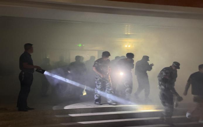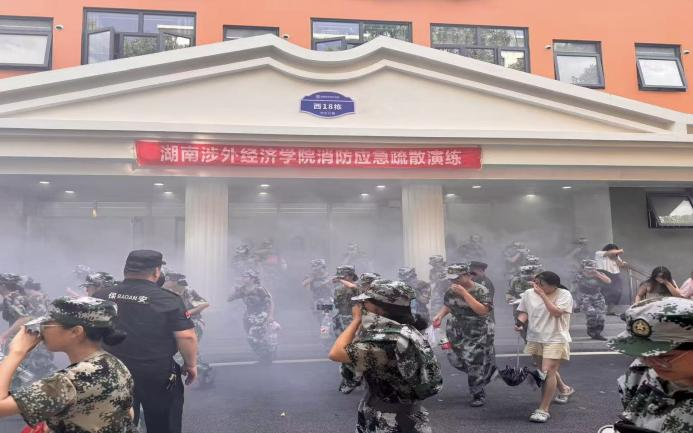 随着警报响起,演练正式启动。各楼层学生在辅导员和保卫处老师的共同引导下,用湿毛巾捂住口鼻,弯腰低姿,按预定路线迅速、有序撤离至安全区域。楼梯口、转角处均有教师和安保人员联动指挥,提醒注意事项,全程紧张而不慌乱,紧凑高效。