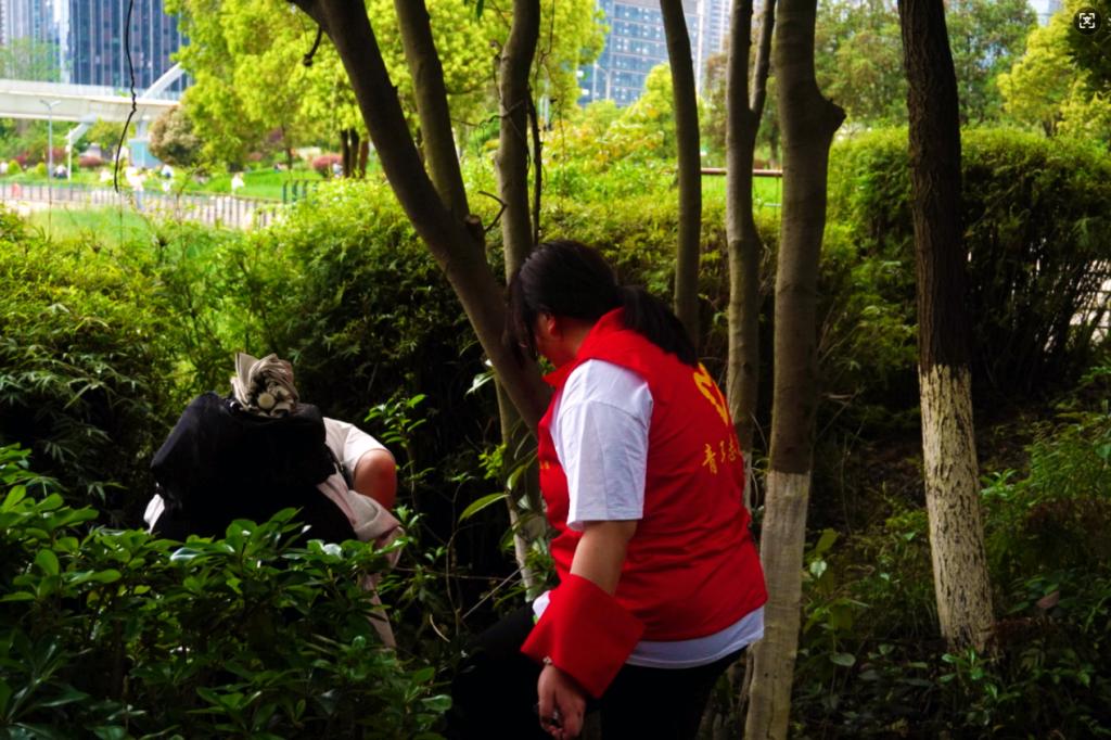 志愿者深入绿化带清理隐蔽垃圾