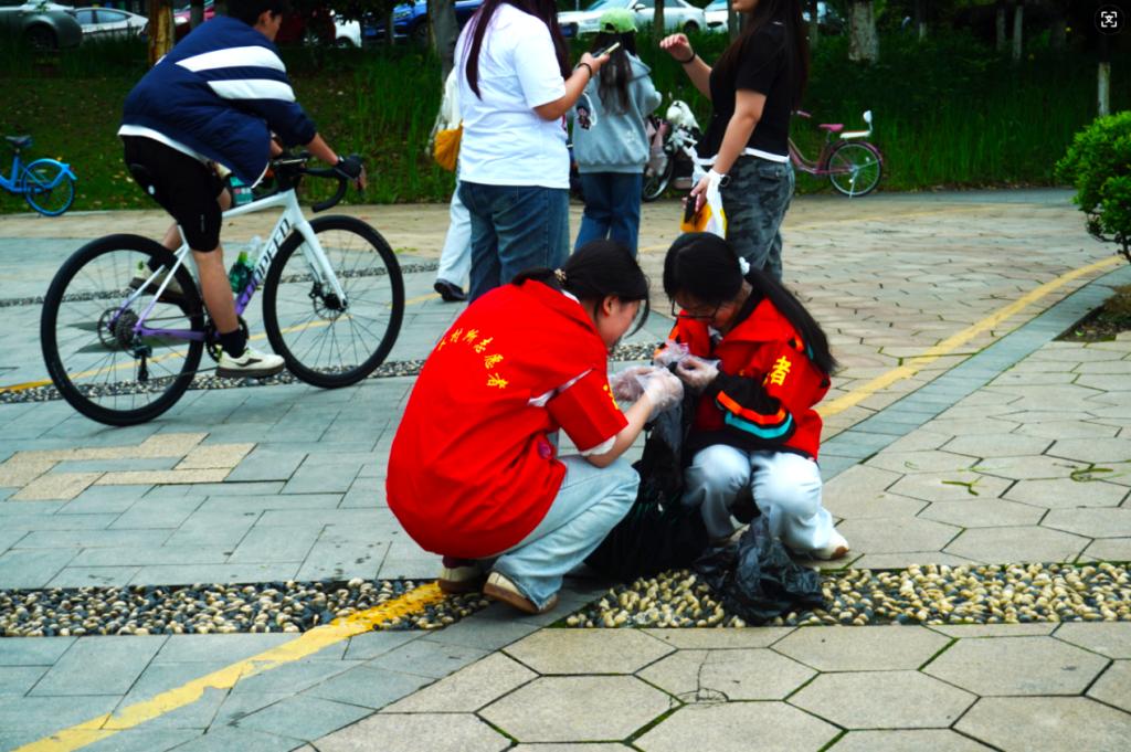 活动当天,志愿者们统一着装、准时集合,在明确分工与安全提醒后,迅速投入环境清洁与文明宣传工作。大家手持垃圾夹、分类垃圾袋、手套等工具,沿梅溪湖步道、草坪、观景台及亲水区域进行 “地毯式” 清理,重点捡拾烟头、塑料瓶、纸屑、食品包装等生活垃圾,细致清理绿化带。在活动过程中,志愿者们严格落实垃圾分类要求,将可回收物与其他垃圾分别收纳,确保清理规范、处置有序。