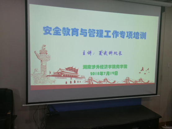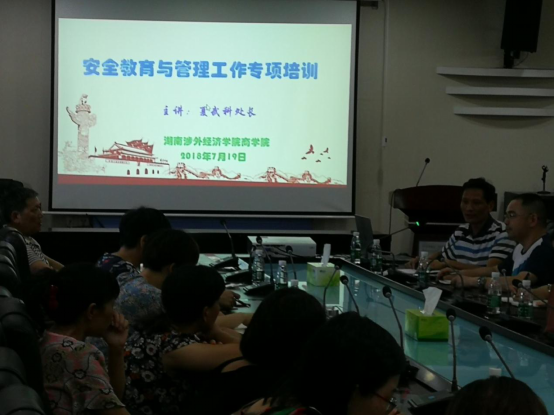 2018年7月19日下午3时,商学院特邀安全保卫处夏武科处长在院办三楼会议室对全体学生工作者及所属楼栋宿舍管理员举行了安全教育与管理工作的专题培训。培训会由商学院党总支书记唐志文主持,全体学生工作者及宿舍管理员参加了会议。