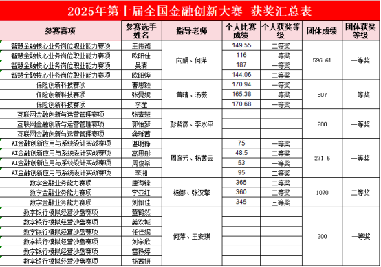 参赛选手在激烈的比赛中沉着应战,发挥了良好的专业技能水平,最终智慧金融核心业务岗位职业能力赛项获得“团体一等奖”,王伟诚、欧阳佳、欧阳烨三位同学均获得“个人二等奖”,吴清获得“个人一等奖”;保险创新科技赛项获“团体一等奖”,曹思颖、张曼妮、李滢三位同学获得“个人一等奖”;互联网金融创新与运营管理赛项获(团队赛)“团体一等奖”, AI金融创新应用与系统设计实战赛项获“团体一等奖”,湛明静、高俊希两位同学获得“个人一等奖”,高思彤、李湘两位同学获得“个人二等奖”;数字金融业务能力赛项获“团体二等奖”,唐海锋、李亚红静、高俊希两位同学获得“个人二等奖”,刘佩佳同学获得“个人三等奖”;数字银行模拟经营沙盘赛项获“团体一等奖”。向娟、杨茜云和何萍等指导老师获得“优秀指导教师”荣誉称号。该成绩的取得是我院教学改革、重视实践教学的成果体现,展现了我院师生良好的专业综合素质,将会进一步促进专业优秀人才的培养。